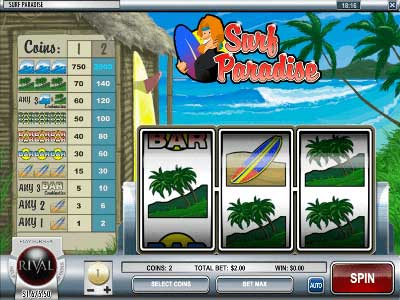 The first one is titled Surf Paradise. The setting with the blue sea waves breaking on a shore line with palm trees is perfect for surfing. The artwork is typical of Rival Gaming with bold symbols in pastel colours. The largest payouts are awarded by the surf and the palm tree. These symbols also pay out in mixed combinations. The usual single bar, double bar and triple bar symbols of classic pokies are crafted in bright colours. A surfing pokie needs the surf board symbol. This pays out even if one or two appear in the payline. There are some excellent win animations to enhance the visual appeal of playing the pokie. When surf board symbols participate in winning combinations then a surfer runs across the screen. Surf Paradise has a single payline. You can wager 1 coin or 2 coins. The coin dimension varies from AU$0.10 to AU$25. You should always go for 2 coins because this gives you an advantage in the top payout.