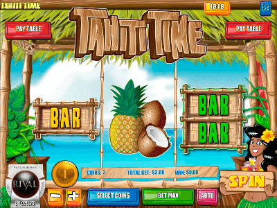Tahiti Time is from the portfolio of Rival Gaming. As the game loads you feel that you are shown some of the best sights of the island. The online pokie has three reels with a single payline. The symbols are bold and colourful but have transparent backgrounds so you can get and therefore players can get a full view of the sea and the sky in the background. Players can wager up to three coins per payline and the coin size varies from AU$0.10 to AU$10. The high paying symbols are the differently coloured Tiki heads. The blue Tiki head offers the highest line payout of 7,500 coins, which indicates high volatility, especially because the payouts fall substantially for other winning combinations. The Tiki heads also pay out in mixed combinations. The other symbols are also thematic. They include pineapple and coconuts, fruit cocktail and hibiscus flower. Two guitar symbols award 5 free spins and three guitar symbols award 20 free spins. All payouts are tripled during the free spins. Being a classic slot, you also have the characteristic single, double and triple bar symbols, but with a Tahiti touch.