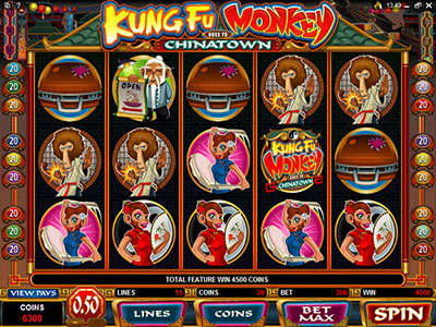 The Kung Fu Monkey logo is the wild symbol. It also awards the largest line payouts. You are paid 2500 times the line bet when five of these symbols appear in an enabled payline. The online pokie has two scatter symbols. The Chinatown symbol appears only on reels 2, 3 and 4, while the gong symbol appears only on reels 1 and 5. When each set of the scatter symbols appear on their respective reels they award pay out equal to the total bet.