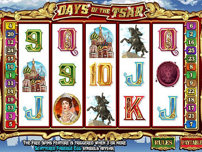 Days of the Tsar online pokie is from the portfolio of Microgaming. It can be played at Australian online casinos like All Slots and Casino Mate. The regime of the Tsars was full of pomp and splendour, which is immediately conveyed by the gold border on the reels. The Tsar obviously is the most important symbol. It is the wild symbol and it also awards the highest line payouts. Five Tsar symbols on an active payline pay a massive 10,000 times the line bet. You can expect high volatility in this online pokie. The next highest line payouts are awarded by the Tsarina. The other high paying symbols are the Kremlin, statue and the Tsar’s seal. The low paying symbols are playing card icons. These add to the theme through their ornate designs and gold colour. The Faberge Egg is the scatter symbol. Not many players would know that this exquisite ornament was individually crafted for the Russian aristocracy and few of these masterpieces are in existence today. James Bond fans would recall the part played by the Faberge Egg in the movie Octopussy. In this video pokie the Faberge Egg awards payouts multiplied by the total bet and triggers the free spins feature. The number of free spins awarded is revealed by the Faberge Eggs in the triggering spin. All free spin payouts are doubled.