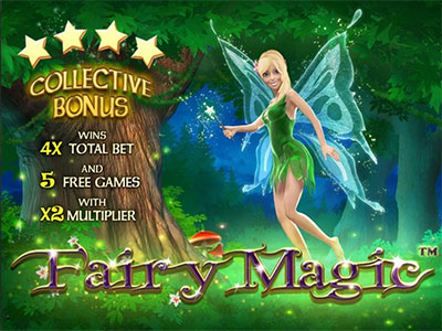 Fairy Magic online pokie offers a unique bonus feature called Collective Bonus. This is triggered by the fairy herself. Whenever the fairy appears on any reel she drops a star, which gets collected below that reel. When four stars below any reel are collected in this manner, the Collective Bonus round is triggered. The Collective Bonus round awards a payout of four times the total bet as a bonus and triggers five free spins with doubled payouts. If the fairy lands in the reels during the free spins additional five free spins are offered. After the feature the stars below the triggering real are cleared, but the stars below the other reels are carried forward.