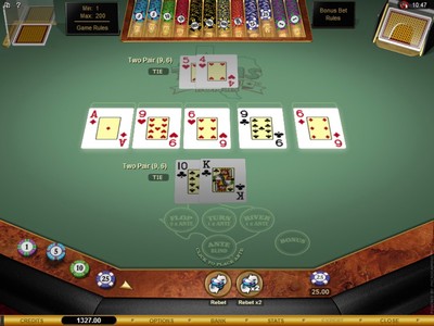 Texas Hold’em Bonus is a strategy intensive game. After the ante bet, you have to know and follow the optimum strategy on whether or not to place the other bets. If you play with optimum strategy, then you can expect an average return of about 98%. Though this is not as high as many online blackjack variants, it is attractive enough. Since the payout is even money, you have to be willing to grind for long periods. To tempt you Texas Hold’em Bonus offers a bonus bet. This is paid depending on the player’s and dealer’s hole cards. If you are dealt any pair from twos to tens the bonus bet pays out 3 to 1, irrespective of the dealer’s cards. If both you and the dealer are dealt an ace pair the bonus bet pays 1000 to 1. Despite the attractive payouts, the bonus bet has a low average return and should be avoided.