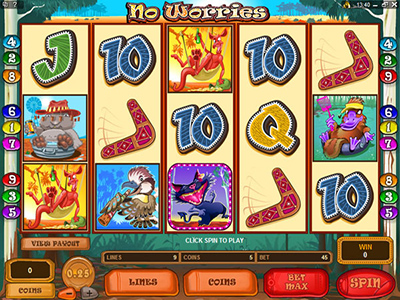 Looking at the popularity of this online pokie, Microgaming released it in a multi-player format. Multi-player pokies allow many players to wager simultaneously in a unique manner. In multi-player No Worries up to 30 players can wager together in a virtual room. To start with you can see only your screen but can chat with other players in the room. As you wager, you will earn points which will determine your rank on a leader board in which all participants figure. Randomly after any spin the Aussie Windmill Pump bonus round may be triggered. When this happens all players are taken to a common second screen. The screen displays a wheel with 18 segments. Each segment has one of five Australian animals. Each animal awards a percentage of the jackpot amount ranging from 10% to 100%. The wheel is spun to determine the portion of the jackpot that will be distributed in the bonus round. The top ten players on the leader board share the jackpot distributed according to their rank.