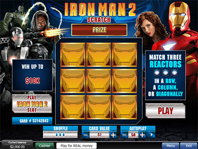 In the Blade scratch card, the three matching symbols can appear scattered on the grid. However, you can scratch only four of the nine cells. The payout multiplier is randomly determined for each game. In Iron Man 2 you have to get three reactor symbols in a horizontal, vertical or diagonal line. Elektra scratch card works similarly. But you can match any of the like weapons symbols. In both these scratch cards the payout multiplier is randomly determined. The Fantastic 4 scratch card is played on 4×4 grid. You have to match any of the four super heroes in a horizontal, vertical or diagonal line. There is a bonus feature offered when all of the Fantastic 4 members appear in any position on the scratch card. You get to play a free card.