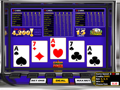 The five cards payout table is the usual Jacks or Better one. Four cards and five cards winning combinations are not possible in the other two payout tables. The sequence of hand rankings in ascending order for these payout tables is as follows: jacks or better, flush, straight, three of a kind, straight flush and mini royal flush, which is A, K and Q of the same suit. Another challenge has been introduced by Betsoft in Pyramid Video Poker by giving different payouts for the three cards tables.