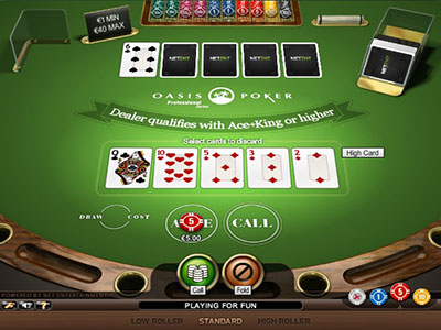 The game begins in the usual manner. You place the ante wager and will be dealt five cards face up. The dealer is dealt one card face up and four cards face down. Based on the cards that you can see you have to decide how many cards you want to replace. You can replace all five or retain all five or any number in between. Normally this decision is based only on the basis of the likelihood of getting the best final hand, but in Oasis Poker you also have to factor in the cost of replacement.