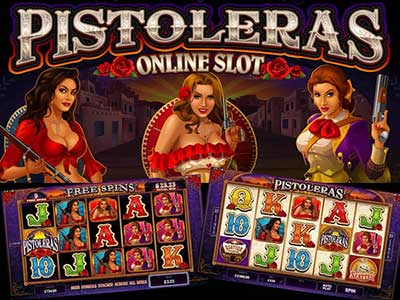 Pistoleras online pokie goes one step ahead and features three cowgirls. But it is the game logo that is the wild symbol with a 3x multiplier property. The wagon symbol awards up to 25 free spins in which all payouts are tripled. The three pistoleras appear stacked on the reels in this feature. In the Saloon Bonus feature on the second screen you shoot at targets in a saloon. When you uncover three of the same girl you win the bounty on her head.
