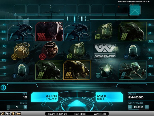 Aliens is a branded online pokie based on the 20th Century Fox movie of the same name. You need a graphics accelerator enabled to load the high resolution 3D graphics and the sci-fi animation. With three levels of game play and a bonus at the end if you succeed, Aliens is in many ways like an arcade game. The reels are set in the console of a spaceship and the background music is appropriate to the sci-fi theme. The symbols awarding the line payouts are all various aliens taken from the movie. The Weyland-Yutani Corp logo is the wild symbol.