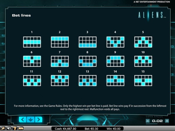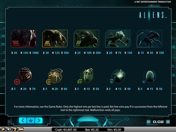 Aliens is a 15 paylines online pokie with all paylines enabled by default. You can wager in coin denominations of 0.01 up to 1.00 per pay line, and wager from 1 to 10 coins per line. The minimum total bet amount is AU$0.15 and the maximum total bet amount is AU$150.00 per spin. This is suitable for both low rollers and high rollers. Aliens has a Skill Stop feature that permits you to stop the reels from spinning whenever you want in order to increase the possibility of getting winning combinations.