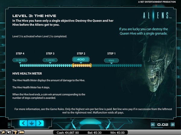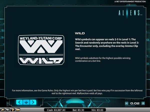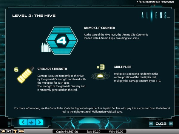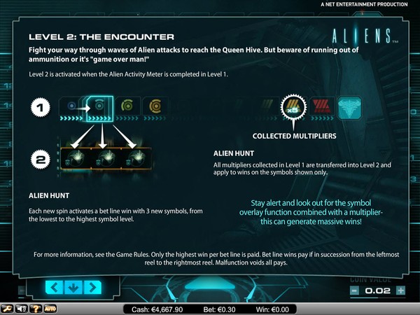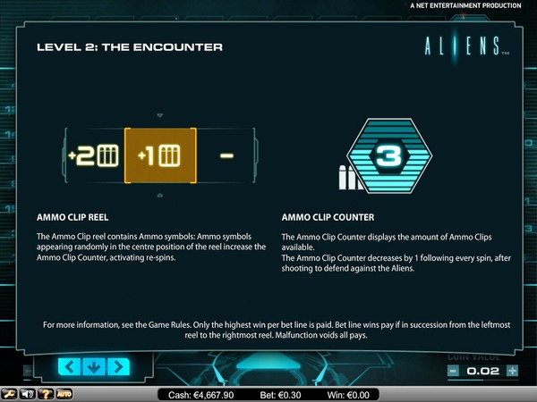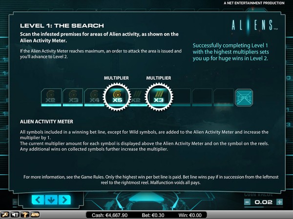 The online pokie starts in Level 1: The Search. The objective is to fill up the Alien Activity Meter. As you get winning combinations on the reels the participating symbols enter the meter and also increase the multiplier by 1. When the meter is full, you move to Level 2: The Encounter. The multipliers are carried forward. The Ammo Clip comes into play. The Ammo Clip counter decreases by 1 each spin. It increases by 2 for each ammo symbol that appears on the reels. The spins continue till you have ammunition. When the Alien Activity Meter is again complete you move to Level 3: The Hive. In this level the reels will spin till you run out of ammunition or you destroy the Hive.