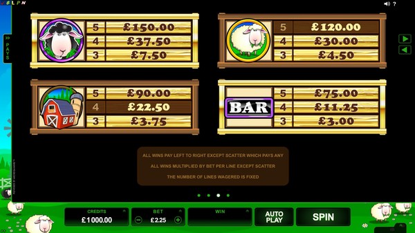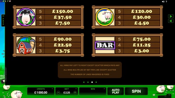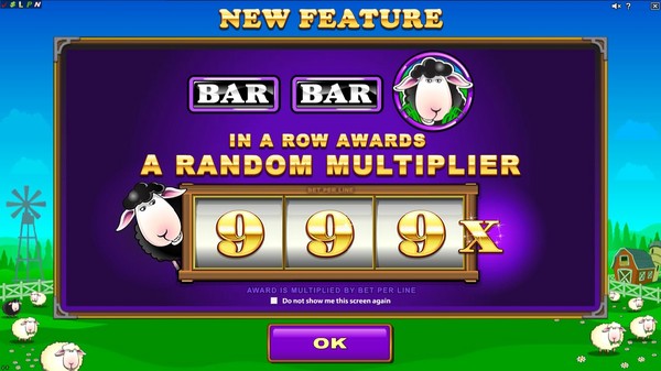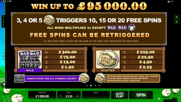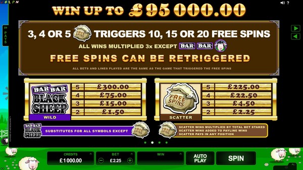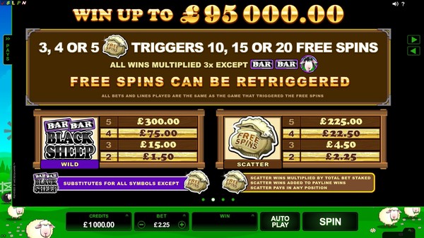 The video pokie brings in modern functionality to attract contemporary players. Microgaming has introduced an innovative Bar Bar Black Sheep bonus feature in this online pokie. Taking its significance from the name, this on-screen bonus feature is triggered when you land two bar symbols followed by the black sheep symbol. The symbols have to appear in a straight row and not in a payline, and they must appear in adjacent cells. Wild substitutions will not count for the trigger. The three symbols turn into a mini reel set, with each reel containing numbers up to 9. The reels are spun and the number displayed multiplies the line bet to give your bonus award. The maximum that you can win is 999x the line bet. This feature is available both in the base game and the free spins. Three, four or five scatters trigger 10, 15 or 20 free spins respectively. All payouts are tripled except those arising from the Bar Bar Black Sheep bonus feature. The free spins can be retriggered.