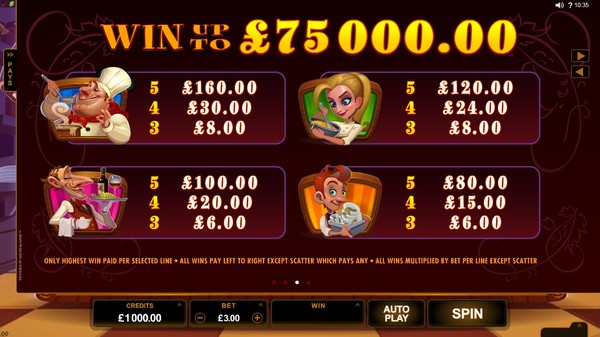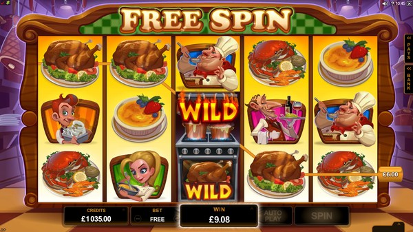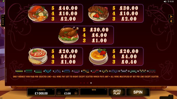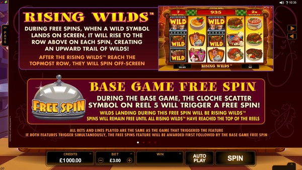 The Big Chef logo is the wild symbol. Another reason for landing more of this symbol is that it awards the top line jackpot. Three or more menu scatter symbols anywhere on the reels trigger 10 free spins with doubled payouts. During a free spin, the wild symbol activates the Rising Wild feature. In each successive spin it rises to the place above, creating a trail of wilds. The cloche symbol appearing anywhere on reel 5 awards a free spin in the base game. But if a wild symbol appears in this spin, the Rising Wilds feature will be activated, giving more free spins.