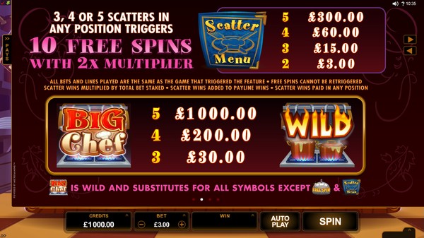 • Big Chef has the mouth-watering theme of fancy cuisine with appealing symbols and animation