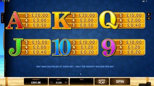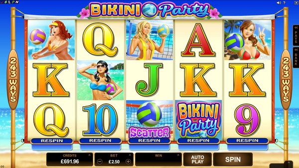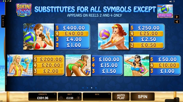 Bikini Party is in the 5×3 format with 243 ways to win paylines structure. This means that symbols can occupy any position on the reel to be a part of the winning combination, as long as they appear from left to right starting from the first reel. You can wager from 1 to 10 coins per payline. The coin size can be varied between AU$0.01 to AU$5.00 in the available options. The maximum line bet works out to AU$50. The total bet is the line bet multiplied by 25, which is a fair call. The maximum total bet is AU$1250. High rollers at Australian online casinos should be completely satisfied with this. The maximum line payout is 4,000 times the line bet, which works out to AU$200,000 at maximum bet. Microgaming reports a payout percentage around 97.5%, which is definitely above par.
