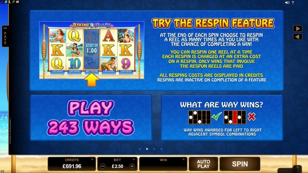 The free spins feature in Bikini Party is a simple affair. It is triggered when three or more beach volleyball symbols appear scattered anywhere on the reels in the same spin. You will be awarded 15 free spins in which all payouts are tripled. The feature can be retriggered. Apart from the visual appeal, the highlight of Bikini Party is the Respin feature. You may have played it in some earlier Microgaming online pokies. There is a button below each reel. After every spin, a Respin value is displayed on each button. If you think there is merit in spinning only one reel, keeping the others fixed, then you have to pay the Respin value for that reel. You will find that when there is a possibility of a high payout then the Respin value will be large. You must keep a few things in mind about the Respin feature. It does not guarantee a payout. It is optional and you can move to the next spin without activating it. If you change any of the bet parameters then the Respin values will be reset and you will have to start from scratch.