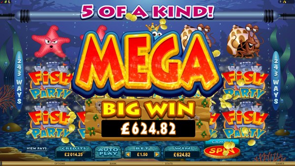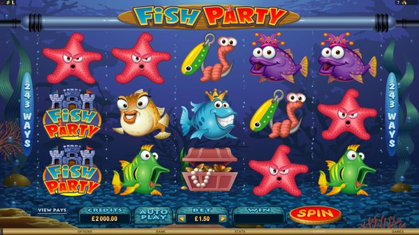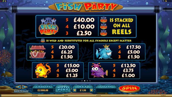 Fish Party is a comically crafted online pokie from Microgaming. The reels are set under the water and the symbols consist of caricatures of an assortment of fish in bright colours. There are no playing card icons so you will see only thematic symbols on the reels. The lure adds an interesting touch to the symbols. The Fish Party logo set in a castle is the wild symbol and the clam is the scatter symbol. The win animations are as awesome as the graphics. The fish dance about with their eyes rolling in glee. The animations are accompanied by peppy audio.