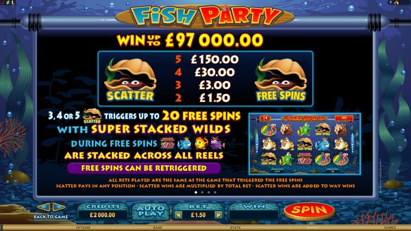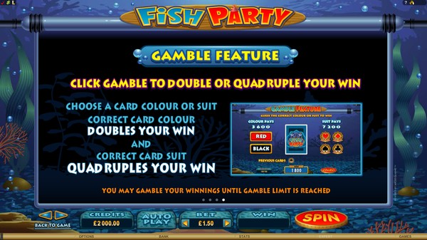 The Fish Party logo awards the highest line payouts and can appear stacked on any reel. The clam awards scatter payouts when two or more appear anywhere on the reels. Three or more scatter symbols award up to 20 free spins. The free spins will be played at same bets and paylines as the triggering spin. There is no payout multiplier in the free spins, but there are other benefits. The reels are super stacked with the wild symbol. Some of the other symbols also appear in stacks. This can lead to big wins. The free spins can be retriggered. Fish Party online pokie also offers the Microgaming Gamble feature after any win. This feature is optional and you can collect your winnings if you want to. The Gamble feature gives you a chance of multiplying your winnings at zero house edge. You have the option of either guessing the colour or the suit of the next card dealt. If you guess correctly then you will respectively double or quadruple your payout. But if your guess is wrong your payout will be lost. The winnings from the Gamble feature can be wagered successively till the gamble limit is reached.