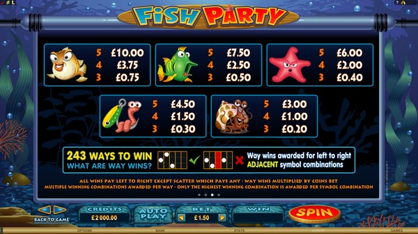 Fish Party online pokie offers the 243 ways to win payline structure and this ensures more frequent wins. You can wager up to 10 coins per payline. The coin size range can be varied from AU$0.01 to AU$0.25. The total bet is 30 times the line bet. The maximum total bet is AU$75. The payout table adjusts to the bet made and directly reads the total payout. It can be displayed in coins or in credits. The line payouts are on the lower side, but this is the case with 243 ways to win pokies. The maximum payout per spin is AU$485,000.