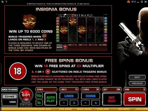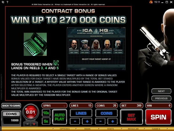 If you like bonus features then you will love the Hitman pokie. Three or more ‘18’ symbols scattered on the reels award 18 free spins with doubled payouts. ‘18’ probably refers to Mission No. 18. The other bonus features can be triggered during the free spins. The free spins cannot be retriggered. The Insignia bonus is triggered when three insignia symbols appear anywhere on reels 1, 2 and 3. You have to select one of the symbols to win a bonus of up to 6,000 coins. The Contract bonus feature is triggered when the Bonus symbol lands anywhere on reels 3, 4 and 5. The second screen displays five targets for Hitman. You select one of them and are awarded a bonus amount. In the second stage you have then to choose a weapon for Hitman to use. You will be awarded a random multiplier. Your total bonus from this feature is the product of the two values. You can win up to 270,000 coins in this feature.