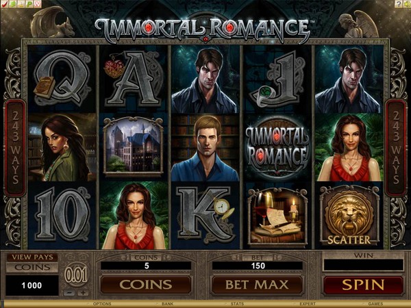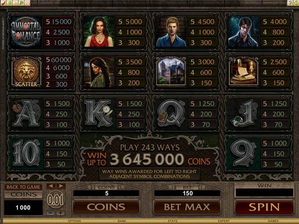 Immortal Romance has 243 ways to win. Like symbols on any spots in adjacent reels can result in payouts. The Immortal Romance logo awards a payout of 1500 times the line bet when the symbol appears in each reel. This is a good top payout for a 243 ways to win slot game. The minimum total bet is only AU$0.30. You can enjoy this landmark online pokie with a very modest bankroll. You can win up to AU$364,500 in Immortal Romance.