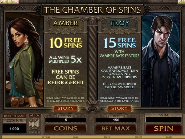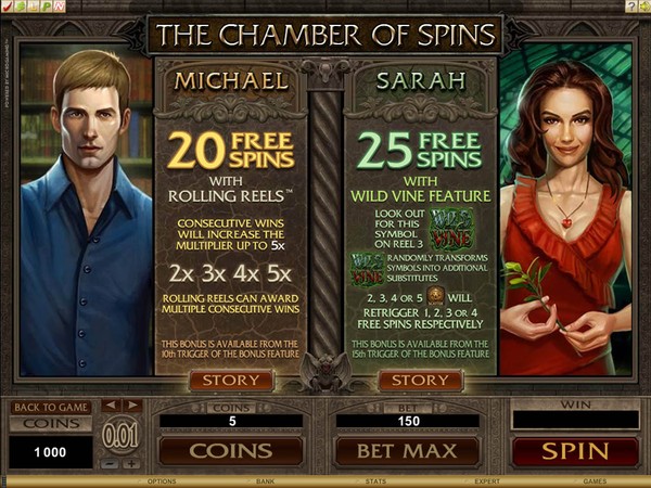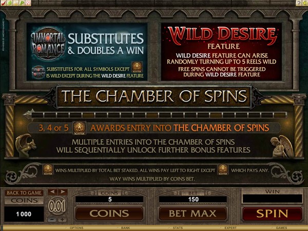 But it is the Immortal Romance logo that is the most powerful symbol. It is the wild and doubles payouts when substituting in winning combinations. It also awards the highest line payouts. The highlight of this online pokie is the Chamber of Spins feature that is triggered when you land three or more door knocker symbols. Each character awards a set of free spins which are played out in turn. Amber awards 10 free spins with payouts multiplied 5 times. Troy awards 15 free spins in which vampire bats can randomly turn symbols into multipliers. Michael awards 20 free spins with the popular Microgaming Rolling Reels feature. Sarah awards 25 free spins in which the Wild Vine symbol randomly turns other symbols into wilds. The randomly triggered Wild Desire feature can turn up to 5 reels wild, but do not expect this to happen often.