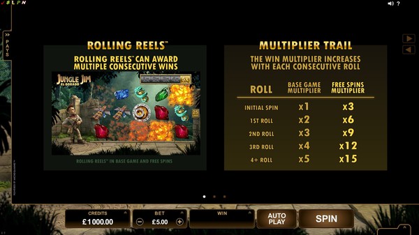 The two main special symbols to keep an eye out for include the Stone Calendar Scatter Symbols and the Jungle Jim Logo Wild Symbols. The Wild Symbols can substitute all other symbols on the reels and they can land in any positon across the reels, but the Scatter Symbols can only ever show up on reels 1, 2 and 3. This game also has Rolling Reels™ and an Multiplier Trail which are explained below: