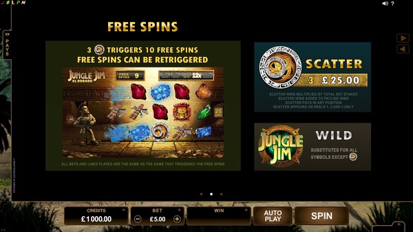 The Jungle Jim – El Dorado online pokie has 5 reels and 25 winning paylines and it was developed by an industry award-winning online casino software provider called Microgaming. This action-packed online pokie is available to Australian players in the real money mode and in the free play demo mode and it has a Jungle Exploration/Adventure/Treasure/Gold theme.