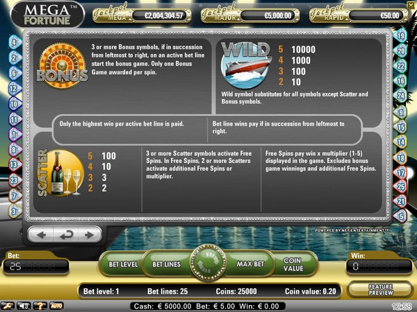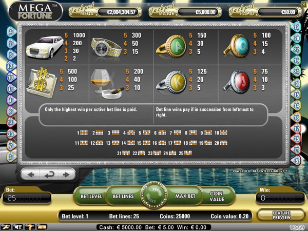 Mega Fortune is 25 paylines online pokie. Play with all paylines enabled. It would be a tragedy if you landed the bonus symbols on an inactive payline. You can wager up to 4 coins or bet levels and select a coin size from 0.01 to 0.50. With all paylines enabled, the minimum bet per spin is AU$0.25 and the maximum bet per spin is AU$50 credits. The top line payout of 10,000 coins is for the wild symbol. Mega Fortune is a high variance pokie.