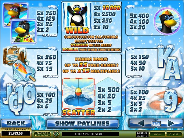Penguin Vacation is a 20 paylines video pokie. As always you should play with all paylines enabled. Then the total bet can be varied from AU$0.20 to AU$10.00. Hence this pokie is essentially for low rollers. Five baby penguin symbols in an active payline pay 10,000 coins, which just might tempt the high rollers. The next jackpot payout falls to 750 coins, indicating high variance. The top scatter payout is 500 coins, which is multiplied by total bet.
