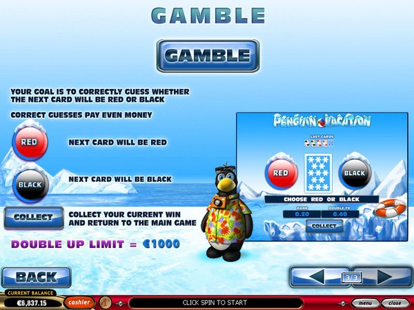 The main bonus feature in Penguin Vacation online pokie is the free spins round. It is triggered when you land three or more fishing hole scatter symbols on the reels. You are immediately awarded 8 free spins and a 2x multiplier. You then move to the second screen where the penguin is fishing. You select two fishing holes for him to win additional free spins and multipliers. This way you may end up with an incredible 33 free spins and a 15x multiplier. If three or more scatter symbols reappear during the free spins you get 15 more free spins with the same multiplier. You can activate the Playtech gamble game after any win in which you have to guess the colour of the next card to double your payout.