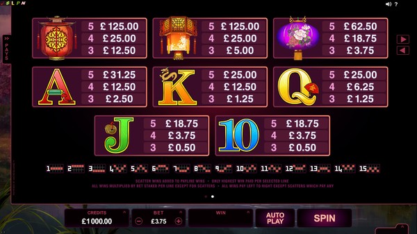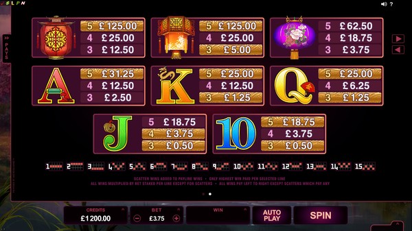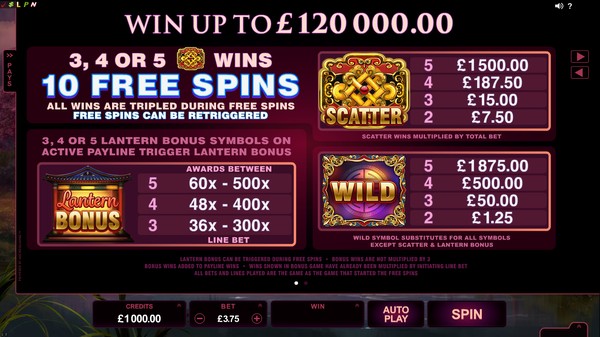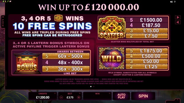 Serenity online pokie uses three special symbols. The Wild logo is the wild symbol and it substitutes for all other symbols except the special symbols. It also awards the highest line payouts. Two or more scatter symbols appearing anywhere on the reels award scatter payouts that are multiplied by the total bet. Three or more scatter symbols trigger 10 free spins in which all payouts are tripled. The free spins can be re-triggered in the usual manner. Serenity also has a thematic bonus game on the second screen. Three or more Lantern Bonus symbols appearing on an active payline trigger this feature. There has to be a bonus symbol on the first reel. 12 objects are displayed on the second screen. You get to pick as many as the number of bonus symbols in the triggering spin. Three picks will award a payout between 36 and 300 times the line bet. Four picks will award between 48 and 400 times and five pick will award between 60 and 500 times. This feature can be triggered during the free spins but the payouts are not multiplied.