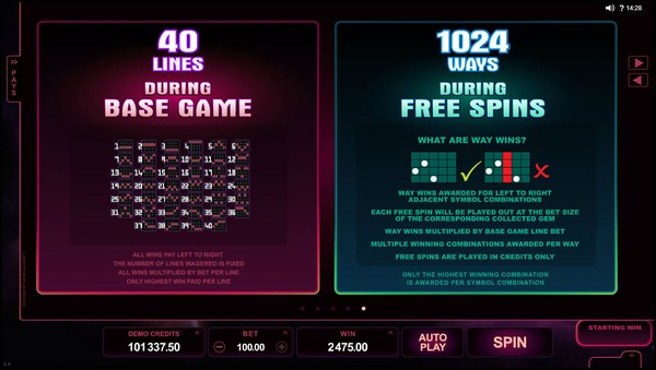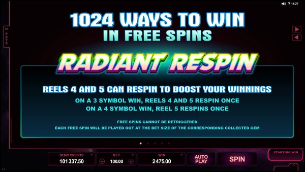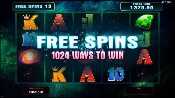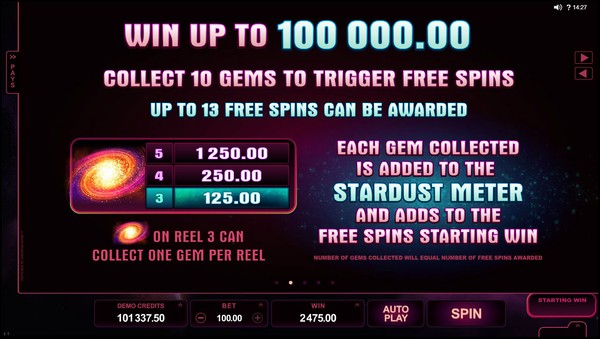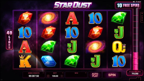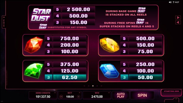 The highest line payouts are awarded by two special symbols. One is the StarDust logo, which is the wild symbol and appears stacked on all the reels. The other is the galaxy symbol, which orbits you to the free spins feature through the StarDust meter. The meter has ten divisions. When the galaxy symbol appears on reel 3, it can pick up to one gem from each of the other reels and pack the meter with stardust. The stardust from gem fills one division. You can get an increase of up to four divisions on the meter in any spin. When the meter is full the free spins feature is triggered. You will be awarded between 10 and 13 free spins. Each free spin will be played out at the bet size of the corresponding gem. During the free spins the format changes to 1024 ways to win. The wild symbols become super stacked. There is an incredible Radiant Respin feature. If there is a 3 symbols winning combination then reels 4 and 5 will respin once to give you the chance of getting a longer winning combination. If there is a 4 symbols winning combination then reel 5 will respin once. The free spins cannot be retriggered. StarDust online pokie has no scatter symbol.