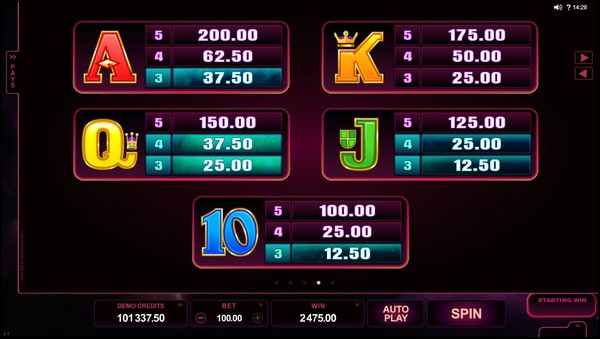 In the base game in the StarDust online pokie you wager with all 40 paylines enabled by default. You can wager up to 10 coins per payline and select the coin size from between AU$0.01 to AU$1.00. The maximum line bet is AU$10.00 and the maximum total bet is AU$400.00. This will suit even the highest of high rollers at Australian online casinos. The payout table adjusts to the selected bet and indicates the absolute payouts. The online pokie has variance on the lower side. The highest line payout of 1000 times the line bet is for the wild symbol. The five of a kind payout for the galaxy symbol is 500 times the line bet.