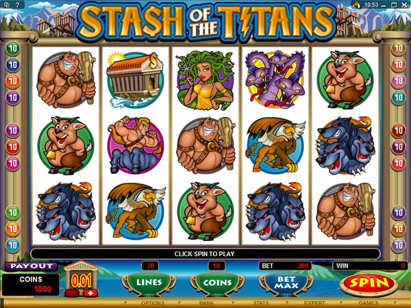 Stash of the Titans online pokie is a spoof on the Greek mythology based Hollywood blockbuster Clash of the Titans. Though the symbols on the reels are all from Greek myths they are presented in a caricature style with comic win animations. The symbols awarding line payments include Perseus astride the flying horse Pegasus, Hydra the many headed serpent, Cyclops the one eyed giant, Griffon the half eagle and half lion, Minotaur, Centaur, Cerberus and Satyr. Stash of the Titans Logo is the wild symbol. It has a particularly interesting animation that depicts Zeus appearing as a shower of gold to woo Danae, the mother of Perseus was born. Medusa the Gorgon who was slain by Perseus is the scatter symbol.