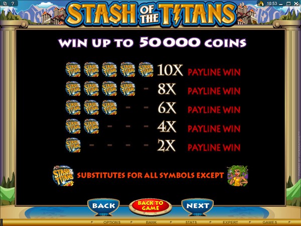 The Stash of the Titans acts as the wild symbol. It multiplies payouts when substituting for other symbols. One wild symbol will double the payout. Two wild symbols multiply the payout 4x and so on, till five wild symbols multiply the top payout by 10x. Three or more Medusa symbols scattered anywhere on the reels activate the free spins round. You will be awarded 15 free spins in which all payouts are multiplied 4x. Therefore the top payout in the free spins round is a whopping 200,000 coins. The free spins are played at the same number of paylines and the same bet as the triggering spin. Getting three or more Medusa symbols in the free spins does not retrigger the free spins.