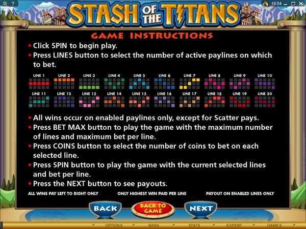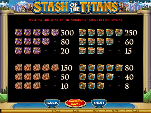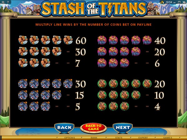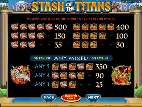 Stash of the Titans is a 20 paylines online pokie and should be played with all paylines enabled. The minimum coin size is AU$0.01 and the maximum coin size is AU$0.20. You can wager up to 10 coins per payline. The maximum total bet works out to AU$40, which makes it an online pokie game essentially for low rollers. The maximum line payout is for five Perseus symbols, which is 500 coins. This appears to be very low for a 20 paylines online pokie. But you have to factor in the wild multipliers. Four wilds with Perseus symbol will pay 4000 coins per coin bet. Five wild symbols give you 10 times the highest pay of 500. At 10 coins per line this works out to 50,000 coins, which at maximum coin size is $10,000.. The maximum scatter payout is 50 times the total bet for five Medusa symbols. Stash of the Titans is a high variance online pokie that will deliver big payouts