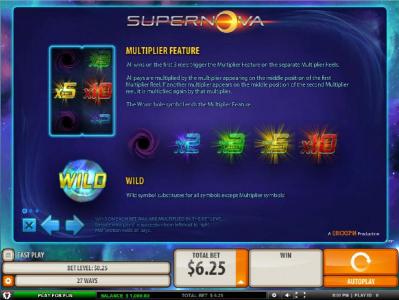 Supernova Bonus – Each time one supernova symbols land on the reels it will burst to leave either a wild in its wake or a random standard symbol.