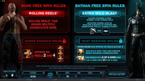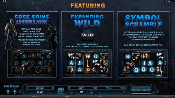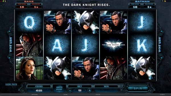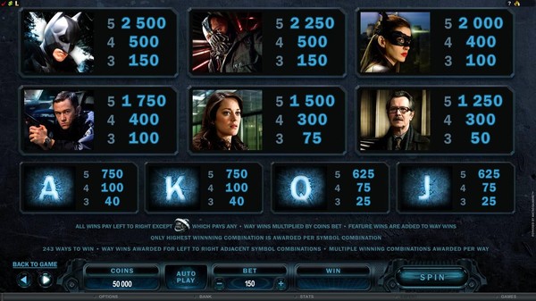 The Dark Knight is a Microgaming branded online pokie featuring the DC Comics superhero Batman. It is based on the hit movie of the same name released by Warner Bros. The entire galaxy of characters from the movie appears as symbols on the reels. Bruce Wayne, Rachel Dawes and The Joker are easily recognisable. Fans of the movie will no doubt identify the rest. The Dark Knight has included the Cinematic Spins feature. You will see the best moments from the film during the win animations. The bat is the wild symbol and it appears stacked in both the base game and the free spins. The Joker graffiti is the scatter symbol.